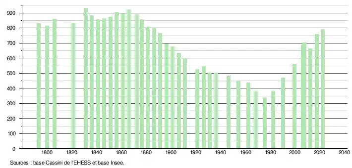 L'évolution du nombre d'habitants est connue à travers les recensements de la population effectués dans la commune depuis 1793. Pour les communes de moins de 10 000 habitants, une enquête de recensement portant sur toute la population est réalisée tous les cinq ans, les populations de référence des années intermédiaires étant quant à elles estimées par interpolation ou extrapolation[22]. Pour la commune, le premier recensement exhaustif entrant dans le cadre du nouveau dispositif a été réalisé en 2007[23].