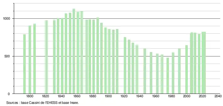L'évolution du nombre d'habitants est connue à travers les recensements de la population effectués dans la commune depuis 1793. Pour les communes de moins de 10 000 habitants, une enquête de recensement portant sur toute la population est réalisée tous les cinq ans, les populations de référence des années intermédiaires étant quant à elles estimées par interpolation ou extrapolation[14]. Pour la commune, le premier recensement exhaustif entrant dans le cadre du nouveau dispositif a été réalisé en 2005[15].