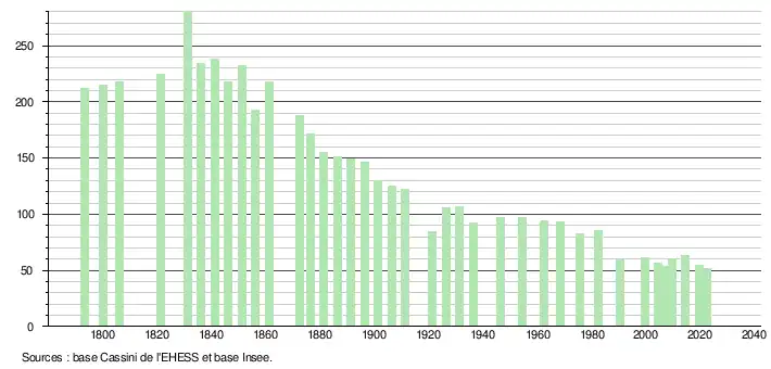 L'évolution du nombre d'habitants est connue à travers les recensements de la population effectués dans la commune depuis 1793. Pour les communes de moins de 10 000 habitants, une enquête de recensement portant sur toute la population est réalisée tous les cinq ans, les populations de référence des années intermédiaires étant quant à elles estimées par interpolation ou extrapolation[19]. Pour la commune, le premier recensement exhaustif entrant dans le cadre du nouveau dispositif a été réalisé en 2004[20].