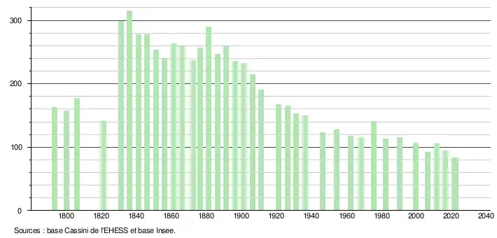 L'évolution du nombre d'habitants est connue à travers les recensements de la population effectués dans la commune depuis 1793. Pour les communes de moins de 10 000 habitants, une enquête de recensement portant sur toute la population est réalisée tous les cinq ans, les populations de référence des années intermédiaires étant quant à elles estimées par interpolation ou extrapolation[14]. Pour la commune, le premier recensement exhaustif entrant dans le cadre du nouveau dispositif a été réalisé en 2006[15].