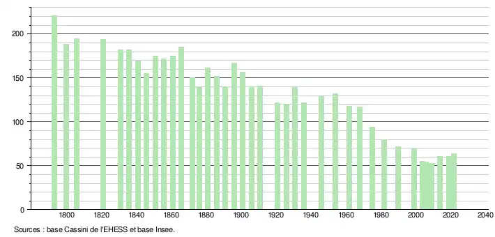 L'évolution du nombre d'habitants est connue à travers les recensements de la population effectués dans la commune depuis 1793. Pour les communes de moins de 10 000 habitants, une enquête de recensement portant sur toute la population est réalisée tous les cinq ans, les populations de référence des années intermédiaires étant quant à elles estimées par interpolation ou extrapolation[39]. Pour la commune, le premier recensement exhaustif entrant dans le cadre du nouveau dispositif a été réalisé en 2004[40].