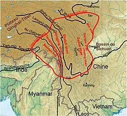 Cinq des plus grands fleuves d’Asie descendent du haut plateau tibétain à 5 000 m vers l’est[n 3] : le fleuve Jaune, le Jinsha (en aval nommé le Yangzi), le Lancang (futur Mékong), le Nu (futur Salouen) et le Yarlung Tsangpo (futur Brahmapoutre). Ils coulent tout d’abord d’ouest en est, puis changent radicalement de direction quand ils se heurtent aux monts Hengduan :