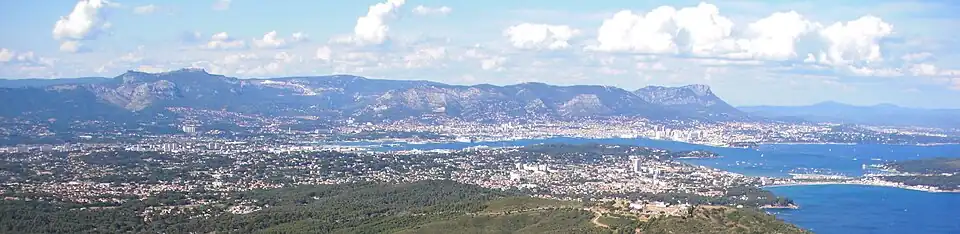 Les Monts toulonnais s'étendent sur une petite vingtaine de kilomètres, de Bandol à La Valette-du-Var et possèdent une altitude moyenne de 500 mètres. Ils constituent une barrière naturelle à l'ouest de Toulon, mais le brusque arrêt de la chaîne représenté par l'« à-pic » du mont Coudon permet une ouverture sur la plaine des Maures.