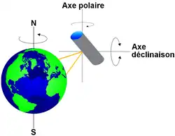 - le suivi du mouvement des objets célestes peut ainsi se faire avec un seul axe uniquement (appelé axe de déclinaison).