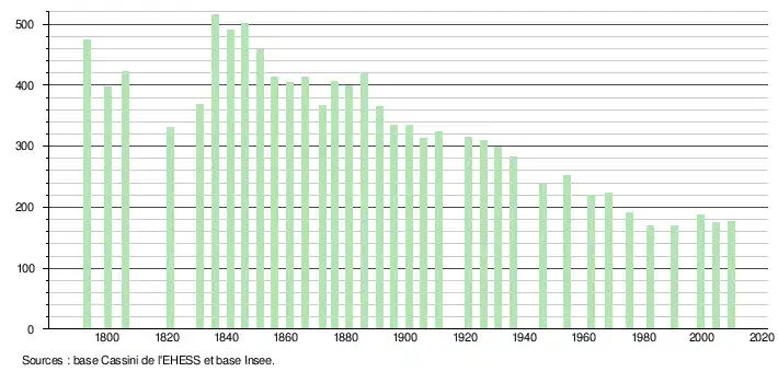- ↑ Par convention dans Wikipédia, le principe a été retenu de n’afficher dans le tableau des recensements et le graphique, pour les populations légales postérieures à 1999, que les populations correspondant à une enquête exhaustive de recensement pour les communes de moins de 10 000 habitants, et que les populations des années 2006, 2011, 2016, etc. pour les communes de plus de 10 000 habitants, ainsi que la dernière population légale publiée par l’Insee pour l'ensemble des communes.