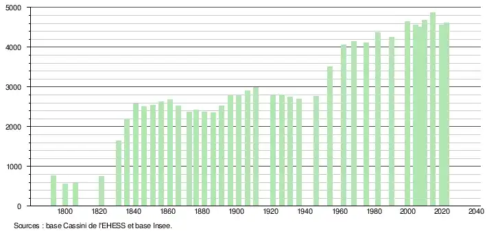 L'évolution du nombre d'habitants est connue à travers les recensements de la population effectués dans la commune depuis 1793. Pour les communes de moins de 10 000 habitants, une enquête de recensement portant sur toute la population est réalisée tous les cinq ans, les populations de référence des années intermédiaires étant quant à elles estimées par interpolation ou extrapolation[39]. Pour la commune, le premier recensement exhaustif entrant dans le cadre du nouveau dispositif a été réalisé en 2004[40].