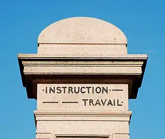 Le sommet du monument arbore la mention « Instruction - Travail », par laquelle on le désigne parfois.