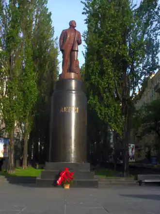 Le , un groupe d'hommes masqués tente de renverser la statue lors de la vague de protestations d'Euromaïdan. La police réagit immédiatement en déployant une petite unité de police antiémeute Berkout qui est attaquée, submergée et forcée de fuir.
