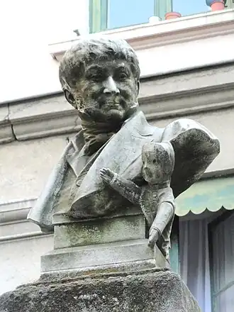 Le buste représente Laurent Mourguet, le créateur de Guignol.