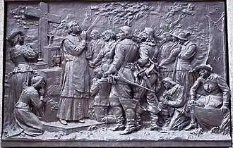 Le monument comporte, entre les figures, quatre bas-reliefs représentant des scènes historiques.
