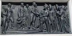 Le piédestal est orné de deux bas-reliefs représentant des scènes de la vie de Pierre IV. Les bas-reliefs originaux ont été réalisés en marbre de Carrare, plus tard ils ont été remplacés par d'autres en bronze. Ceux-ci ont été volés en 2007, l'année où la statue a été restaurée selon le programme Porto com Pinta. Mais quand les échafaudages ont été retirés, les plaques avaient disparu. Deux répliques ont été posées en grâce à des photographies des originaux. L'une des deux représente Le Débarquement de Mindelo où l'on voit Pierre IV donner le drapeau à Tomás de Melo Breyner. La seconde montre La Livraison du cœur de Pierre à Porto. Le cœur est conservé à l'église de Lapa.