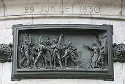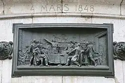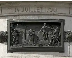 Le piédestal de pierre est ceint de douze hauts-reliefs en bronze, œuvres de Léopold Morice[6], reliés par des rosaces, disposés à la hauteur du regard des passants. Ils constituent une chronologie d'événements marquant l'histoire de la République française, entre 1789 et 1880 :