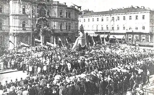 Dans le cadre de la préparation de la Journée de la liberté (uk), le (calendrier julien), le , une manifestation ukrainienne de masse a eu lieu à Kiev sur Krechtchatyk. Le point culminant de cette action fut quand la foule révolutionnaire ukrainienne organisa un « tribunal du peuple » jugeant Piotr Stolypine. Une potence improvisée fut construite autour du monument. Après les discours des « avocats » et des « accusateurs », le « verdict » fut lu, après quoi la figure de Stolypine à l’aide de treuils métalliques a d’abord été suspendue au-dessus du piédestal, puis, sous les cris enthousiastes de la foule, jetée au sol.