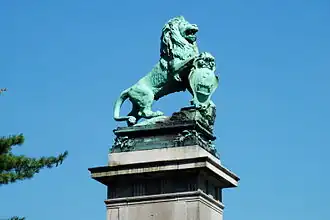 Le monument est constitué d'un socle à degrés et d'un piédestal en pierre bleue portant la statue d'un lion regardant en direction de la France, la patte posée sur un bouclier.