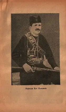 Dans la petite enfance Vojin Popović a échappé en raison du terreur turque de Sjenica à Kragujevac, où il a continué son éducation. Après l'Académie militaire terminée en 1903 à Belgrade, en tant que le second lieutenant d'infanterie, il approchait à l'organisation des tchetniks en 1905, et en 1911 à l'organisation clandestine « L'unité ou la mort » (La Main noire). Il a participé dans les combats conte les Turcs en Macédoine et en Ancienne Serbie dans la période de 1905 à 1912 (Bataille de Čelopek (en), Kumanovo, Prilep, Bitolj, la rivière Vardar ) et contre les Bulgares à la rivière Bregalnica en 1913. Dans la Première Guerre mondiale il est devenu célèbre par les batailles de Drina, Kolubara et surtout celle de Cer, les exploits pour lesquels il a été récompensé de l'ordre de l'Étoile de Karadjordje de IIIème et IVème ordre. Il a atteint le rang de colonel lieutenant d'infanterieda l'Armée serbe.Bien que connu comme sévère et implacable, il a joui la confiance illimitée et est resté en mémoire comme le tchetnik voïvode extraordinaire, à cause de son courage exceptionnel par lequel il menait ses combattants. Ses détachements militaires assuraient l'escorte du prince héritier Aleksandar Karadjordjević à l'occasion de la retraite à travers l'Albanie, après des grandes pertes en 1915. Il a terminé ses combats constants sur la partie la plus difficile du Front de Salonique dans la Première Guerre mondiale comme le commandement de Détachement volontaire dans les luttes contre les Bulgares pour la conquête de Kajmakčalan, le sommet stratégique le plus important de la montagne Nidža, comme en témoignent les plus proches camarades. Après les blessures au Gruniski vis dans la zone de la Tsrna le , le voïvode a poursuit l'expulsion des ennemis, mais il a été baissé par la balle, à la fin de la bataille[1].
