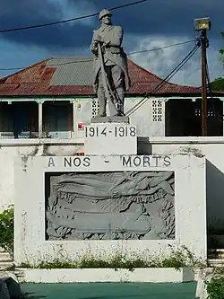 Le monument aux morts est conçu dans un style métropolitain, avec une base blanche en béton portant un bronze intitulé Le Poilu au repos[3], représentant un Poilu debout, casqué et l'arme au pied. Ce bronze est l'œuvre du sculpteur Léon Leyritz (1888-1976) qui la réalise en 1932. Il est produit en série en Métropole par la Société métallurgique Durenne qui le vend également pour le monument aux morts de Saint-Louis à Marie-Galante[3].
