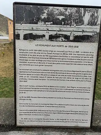À la différence de beaucoup de monuments aux morts qui recensent les soldats des communes tombés au front, celui de Coursan ne comporte aucun nom ; une dalle porte juste la mention « La commune de Coursan à ses enfants morts pour la France[4] ».