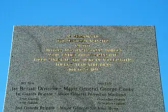 Sous cet hommage figurent les noms des unités britanniques et hanovriennes qui participèrent à la bataille.