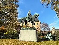 Sur un plateau surélevé face à l'hôtel de ville, la statue équestre de l'empereur, de cinq mètres et demi de haut, se tenait sur un piédestal richement orné de six mètres de hauteur en granit poli. Des reliefs en bronze symbolisant la unité allemande en 1871 et l'insigne impérial y étaient attachés. Le plateau (80 mètres sur 30) était encadré sur le côté par deux balustrades en pierre séparées en quart de cercle. Couronnés de bassins de feu en bronze en forme de vase, ils étaient également pourvus à l'intérieur de divers reliefs relatifs à la fondation de l'Empire allemand et de bancs environnants, interrompus par plusieurs griffons de bronze.