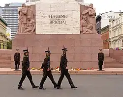 De l'inauguration du monument en 1935 jusqu'en 1940, une garde d'honneur est présente, avant d'être retirée peu après l'occupation de la Lettonie[6]. Elle est rétablie le [6]. Les gardes sont des soldats de la compagnie de la garde d'honneur du bataillon des quartiers généraux des Forces armées nationales (letton : Nacionālo Bruņoto spēku Štāba bataljona Goda sardzes rota)[13]. La garde n'est pas obligée d'être de service en cas de mauvaises conditions climatiques ou si les températures sont en dessous de −10 °C ou au-dessus de 25 °C[14],[15]. Le service de garde dure deux semaines d’affilée, avec trois ou quatre paires de gardes se relevant toutes les heures au cours d'une cérémonie commandée par le chef de la garde[14],[15]. En dehors des deux gardes, il y a également durant chaque service deux soldats de faction qui veillent à la sécurité de la garde d'honneur[15].