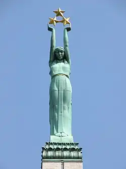 La statue au sommet du monument est surnommée Milda par les habitants de la ville et c'est également ainsi que les Lettons appellent la jeune fille dont le profil orne certaines émissions de sa monnaie. Milda est un prénom féminin letton qui fut extrêmement courant durant la période de l'entre-deux-guerres[35]. C'est donc la figure allégorique nationale de la Lettonie comme l'est l'Oncle Sam pour les États-Unis ou Marianne pour la France.
