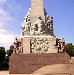 Sur les côtés, les panneaux de travertin portent deux bas-reliefs : « 1905 » (7 ; letton : 1905.gads) en référence à la Révolution russe de 1905, et « La bataille contre les Bermontiens sur le Pont de Fer » (8 ; letton : Cīņa pret bermontiešiem uz Dzelzs tilta, en référence à une bataille décisive à Rīga durant la guerre d'indépendance lettone. Au dos du monument, l'on retrouve deux autres ensembles sculpturaux : « Famille » (12 ; letton : Ģimene) (une mère se tenant entre ses deux enfants) et « Intellectuels » (11 ; letton : Gara darbinieki)[6]. Sur le socle de granit rouge, il y a encore un autre bloc rectangulaire de 6 m de haut et de large et de 7,50 m de long entouré de quatre ensembles sculpturaux de granite gris de 5,50 m - 6 m de haut : « Lettonie » (2 ; letton : Latvija), « Lāčplēsis » (3 ; Tueur d'ours, héros populaire d'une épopée lettone), « Vaidelotis » (5 ; un prêtre païen balte) et « les Briseurs de chaînes » (4 ; letton : Važu rāvēji) (trois hommes enchaînés essayant de se libérer de leurs entraves)[10].