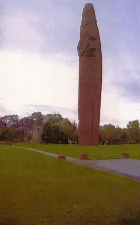 Légèrement placé à l'écart du village, entre le château et l'église, le monument prend la forme d'une borne colossale, coulée sur une armature métallique dans un béton fait d'agrégats roses de Moselle, avec des fondations qui s'enfoncent à 22 mètres dans le sol.