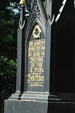 Ce qui signifie « Aux héros tombés, le Roi et la Patrie reconnaissants. Ils reposent en paix. Belle-Alliance, . »[4].