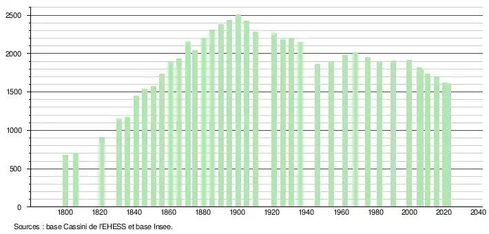 L'évolution du nombre d'habitants est connue à travers les recensements de la population effectués dans la commune depuis 1800. Pour les communes de moins de 10 000 habitants, une enquête de recensement portant sur toute la population est réalisée tous les cinq ans, les populations de référence des années intermédiaires étant quant à elles estimées par interpolation ou extrapolation[24]. Pour la commune, le premier recensement exhaustif entrant dans le cadre du nouveau dispositif a été réalisé en 2005[25].
