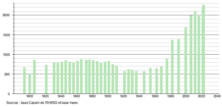 L'évolution du nombre d'habitants est connue à travers les recensements de la population effectués dans la commune depuis 1793. Pour les communes de moins de 10 000 habitants, une enquête de recensement portant sur toute la population est réalisée tous les cinq ans, les populations de référence des années intermédiaires étant quant à elles estimées par interpolation ou extrapolation[13]. Pour la commune, le premier recensement exhaustif entrant dans le cadre du nouveau dispositif a été réalisé en 2006[14].