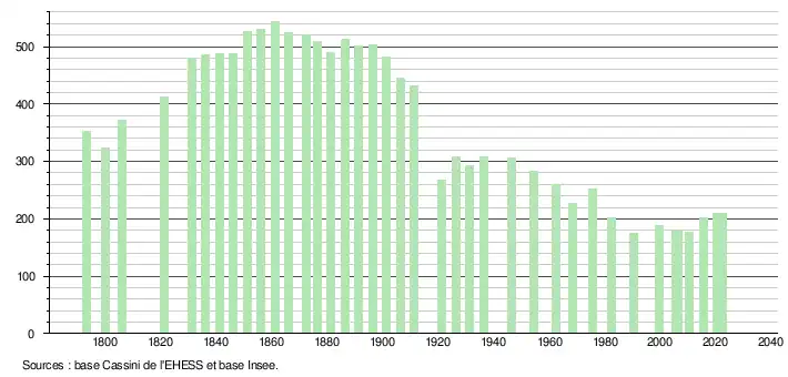 L'évolution du nombre d'habitants est connue à travers les recensements de la population effectués dans la commune depuis 1793. Pour les communes de moins de 10 000 habitants, une enquête de recensement portant sur toute la population est réalisée tous les cinq ans, les populations de référence des années intermédiaires étant quant à elles estimées par interpolation ou extrapolation[34]. Pour la commune, le premier recensement exhaustif entrant dans le cadre du nouveau dispositif a été réalisé en 2005[35].