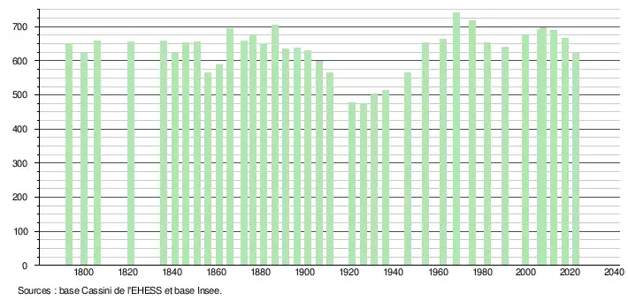 L'évolution du nombre d'habitants est connue à travers les recensements de la population effectués dans la commune depuis 1793. Pour les communes de moins de 10 000 habitants, une enquête de recensement portant sur toute la population est réalisée tous les cinq ans, les populations de référence des années intermédiaires étant quant à elles estimées par interpolation ou extrapolation[12]. Pour la commune, le premier recensement exhaustif entrant dans le cadre du nouveau dispositif a été réalisé en 2007[13].