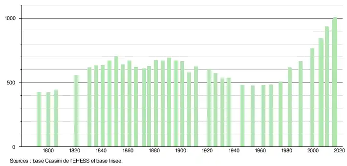 L'évolution du nombre d'habitants est connue à travers les recensements de la population effectués dans la commune depuis 1793. Pour les communes de moins de 10 000 habitants, une enquête de recensement portant sur toute la population est réalisée tous les cinq ans, les populations de référence des années intermédiaires étant quant à elles estimées par interpolation ou extrapolation[8]. Pour la commune, le premier recensement exhaustif entrant dans le cadre du nouveau dispositif a été réalisé en 2005[9].