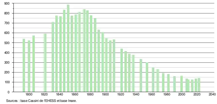 L'évolution du nombre d'habitants est connue à travers les recensements de la population effectués dans la commune depuis 1793. Pour les communes de moins de 10 000 habitants, une enquête de recensement portant sur toute la population est réalisée tous les cinq ans, les populations de référence des années intermédiaires étant quant à elles estimées par interpolation ou extrapolation[14]. Pour la commune, le premier recensement exhaustif entrant dans le cadre du nouveau dispositif a été réalisé en 2008[15].