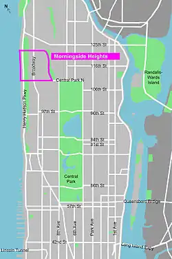 Morningside Heights est un quartier du nord de l'arrondissement de Manhattan à New York. Traversé par la partie nord de Broadway, Morningside est situé près des quartiers de l'Upper West Side, de Harlem et de Riverside Park.