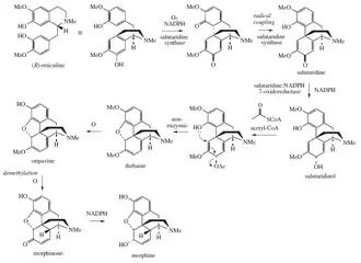 La morphine et les autres alcaloïdes de l'opium sont synthétisés dans la plante de pavot au niveau des cellules lactifères dans les bulbes[13] à partir de la tyrosine, un acide aminé courant dans la nature, qui est transformé en réticuline puis en salutaridine[14].