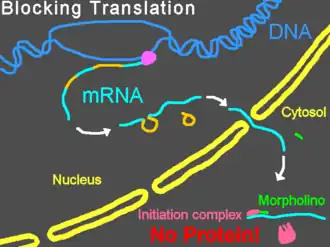 Liés à une région non traduite en 5' d’un ARN messager (ARNm), les morpholinos peuvent interférer avec la progression du complexe d’initiation ribosomique à partir de la coiffe en 5’ jusqu’au codon d’initiation. Cette inactivation de l’expression génétique empêche la traduction de la région codante du transcrit ciblée. Ceci est utile d’un point de vue expérimental lorsqu’un chercheur souhaite connaître la fonction d’une protéine particulière. Les morpholinos fournissent un moyen commode pour inactiver l’expression de la protéine ciblée et étudier comment l’inactivation change la cellule ou l’organisme. Certains morpholinos inactivent l’expression si efficacement qu’après la dégradation des protéines préexistantes, les protéines ciblées deviennent indétectables par électrotransfert[17].