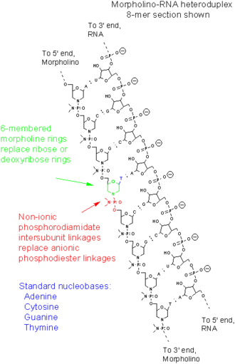 Les morpholinos sont des molécules synthétiques qui résultent d’un réarrangement de la structure naturelle des acides nucléiques[7]. Habituellement d’une longueur de 25 bases, ils se fixent aux séquences complémentaires des ARN par appariement de bases. Du point de vue de la structure, bien que les morpholinos possèdent des bases azotées classiques, ils diffèrent de l’ADN par le fait que ces bases azotées sont fixées sur des cycles morpholines au lieu de désoxyribose. Ces cycles morpholines sont liés entre eux par des groupements phosphorodiamidate au lieu de groupements phosphate[7]. Il est plus facile de visualiser ceci en se référant à la figure 1 et en comparant les structures d’un brin d’ARN et d’un brin morpholino. Le remplacement des groupements phosphate anioniques par des groupements phosphorodiamidate non chargés élimine l’ionisation dans la gamme habituelle de pH physiologique, de sorte que les morpholinos dans les organismes ou les cellules sont des molécules non chargées. Le squelette entier d’un morpholino est formé de ces sous-unités modifiées. Les morpholinos sont plus habituellement utilisés sous forme d’oligonucléotides monocaténaires, de sorte que les hétéroduplexes formés à partir d’un brin morpholino et un ADN complémentaire peuvent être utilisés en combinaison avec la livraison de réactifs cytosolique cationique[8].