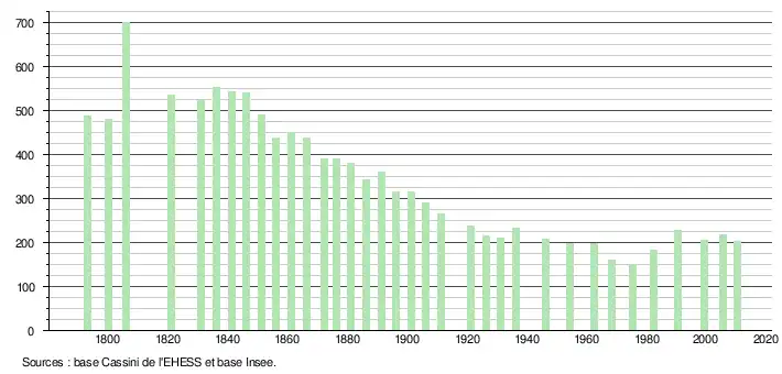 - ↑ Dans le tableau des recensements et le graphique, par convention dans Wikipédia, le principe a été retenu, pour les populations légales postérieures à 1999 de n’afficher dans le tableau des recensements et le graphique que les populations correspondant à l'année 2006, première population légale publiée calculée conformément aux concepts définis dans le décret no 2003-485 du 5 juin 2003, et les années correspondant à une enquête exhaustive de recensement pour les communes de moins de 10 000 habitants, ainsi que la dernière population légale publiée par l’Insee.