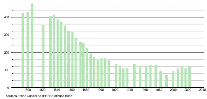 L'évolution du nombre d'habitants est connue à travers les recensements de la population effectués dans la commune depuis 1793. Pour les communes de moins de 10 000 habitants, une enquête de recensement portant sur toute la population est réalisée tous les cinq ans, les populations de référence des années intermédiaires étant quant à elles estimées par interpolation ou extrapolation[21]. Pour la commune, le premier recensement exhaustif entrant dans le cadre du nouveau dispositif a été réalisé en 2006[22].