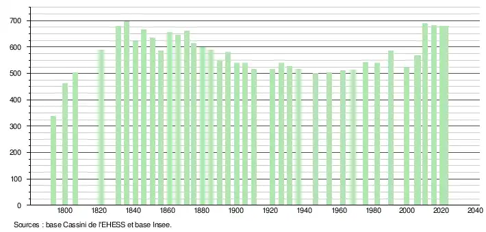 - ↑ Fiches Insee - Populations de référence de la commune pour les années 2006, 2007, 2008, 2009, 2010, 2011, 2012, 2013, 2014, 2015, 2016, 2017, 2018, 2019, 2020, 2021 et 2022.