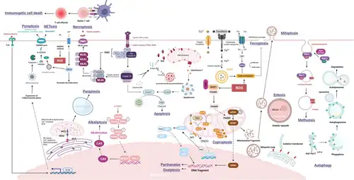 La cuproptose est une forme de mort cellulaire régulée déclenchée par le cuivre[40]. Le terme « cuproptose » est dérivé du mot latin « cuprum », qui signifie cuivre, et du mot grec « ptosis », qui signifie chute. Ceci a été décrit pour la première fois et le terme a été initialement défini en 2019[41]. La cuproptose diffère des autres types de mort cellulaire liée au stress oxydatif, tels que l'apoptose et la ferroptose, et se caractérise par un stress mitochondrial provoqué par l'agrégation d'enzymes mitochondriales lipoylées et la perte de protéines de cluster Fe – S[42].