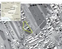 La résidence fortifiée est localisée en à Abbottabad[note 1], ville située à 50 km au nord-est de la capitale Islamabad, réputée pour être un lieu de villégiature privilégié de militaires pakistanais de haut rang et le siège de la principale académie militaire du pays, celle de Kakul Road[19], située à 1,3 km au nord-est de la villa. Des officiels américains utilisent alors des images satellites pour identifier les occupants de ce complexe fortifié. Construit en 2005, celui-ci, valant plus d'un million de dollars, fait environ huit fois la taille de n'importe quelle autre habitation des environs et se situe sur un terrain de 3 000 m2. Les habitants du bâtiment brûlent leurs ordures, à la différence de leurs voisins, qui se contentent de les jeter. La résidence fortifiée n'est pas reliée au téléphone ni à Internet[20]. Elle présente des mesures de sécurité hors-normes, y compris les murs de quatre à six mètres qui l'entourent[21]. Cette résidence, en concluent les spécialistes du renseignement des États-Unis, « a été spécialement construite pour cacher quelqu'un d'important »[20].