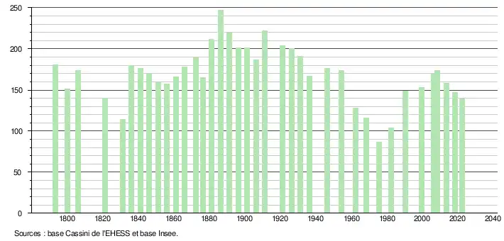 L'évolution du nombre d'habitants est connue à travers les recensements de la population effectués dans la commune depuis 1793. Pour les communes de moins de 10 000 habitants, une enquête de recensement portant sur toute la population est réalisée tous les cinq ans, les populations de référence des années intermédiaires étant quant à elles estimées par interpolation ou extrapolation[39]. Pour la commune, le premier recensement exhaustif entrant dans le cadre du nouveau dispositif a été réalisé en 2008[40].
