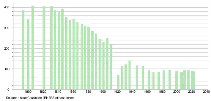 L'évolution du nombre d'habitants est connue à travers les recensements de la population effectués dans la commune depuis 1793. Pour les communes de moins de 10 000 habitants, une enquête de recensement portant sur toute la population est réalisée tous les cinq ans, les populations de référence des années intermédiaires étant quant à elles estimées par interpolation ou extrapolation[31]. Pour la commune, le premier recensement exhaustif entrant dans le cadre du nouveau dispositif a été réalisé en 2005[32].