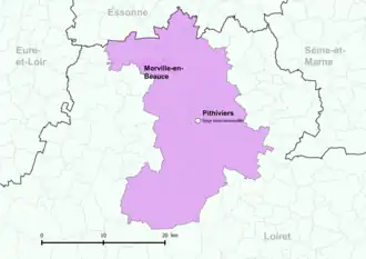 La loi du portant nouvelle organisation territoriale de la République (dite loi NOTRe), visant une réduction du nombre d'intercommunalités en France, fait en effet passer le seuil démographique minimal de 5 000 à 15 000 habitants, sauf exceptions, et a un impact sur les périmètres des différentes intercommunalités. Le schéma départemental de coopération intercommunale du Loiret est arrêté sur ces bases le et le nombre d'établissements publics de coopération intercommunale à fiscalité propre passe dans le département du Loiret de 28 (2 communautés d'agglomération et 26 communautés de communes) à 16 (deux communautés d'agglomération et 14 communautés de communes dont une interdépartementale)[38]. Les communautés de communes de Beauce et du Gâtinais, du Cœur du Pithiverais et du Plateau Beauceron fusionnent ainsi à compter du en une seule entité : la communauté de communes du Pithiverais, dont le siège est à Pithiviers. Cette nouvelle intercommunalité comprend 31 communes dont Morville-en-Beauce[39].