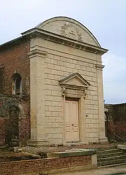 - La façade néoclassique du bâtiment laisse penser que l'édifice a été construit au XIXe siècle. Il fait huit mètres de hauteur pour cinq mètres de largeur et est doté de deux passages latéraux, qui, comme les églises romanes, sont constitués d'arcs en plein cintre. L'utilisation de la pierre pour la façade détonne dans cette région où les bâtiments et édifices sont construits, à partir du XIXe siècle, principalement en brique, dont le reste du bâtiment est d'ailleurs constitué. Sur la partie sud se trouve une sacristie. Lors de sa construction le bâtiment a été surmonté d'un clocher à forme octogonale dans lequel se trouvait une cloche.