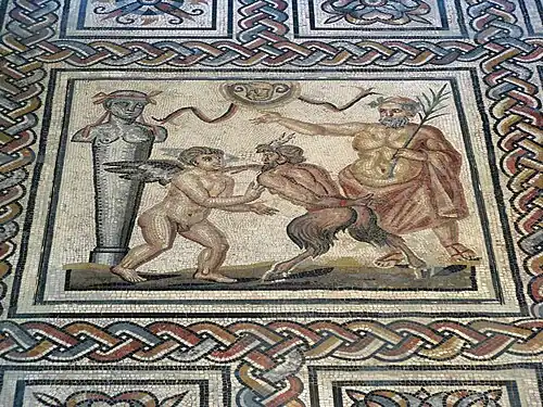 La thématique décorative la plus fréquente des mosaïques du Haut Empire est l'univers dionysiaque, ici représenté par Éros, Pan et Silène, père adoptif de Dionysos[5]. Cet épisode mythologique se retrouve dans d'autres mosaïques à Lyon, à Vienne et en Italie, il symbolise la lutte entre le désir sauvage du dieu Pan et l'amour civilisé, personnifié par Éros.[6]