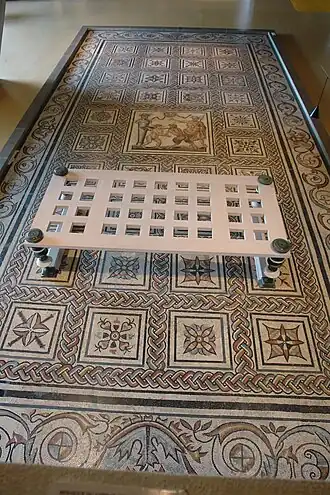 La mosaïque mesure 8,57 × 4,07 m. Elle est constituée de tesselles de pierre et de marbre de 1 cm de côté, plus fines pour le tableau central. L’ensemble est en forme d’échiquier entouré d'une frise de rinceaux. Il comprend 36 cases délimitées par un entrelacs à trois brins, avec un motif central qui occupe l’équivalent de quatre carrés. Chacun des carrés est orné d’un fleuron. Toutefois, certains motifs ont été répétés, voire inventés par le restaurateur, et la composition ne présente donc que vingt-deux motifs différents[7].