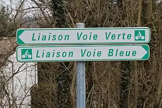 Panneau de liaison entre la voie verte et la voie bleue à Mâcon.